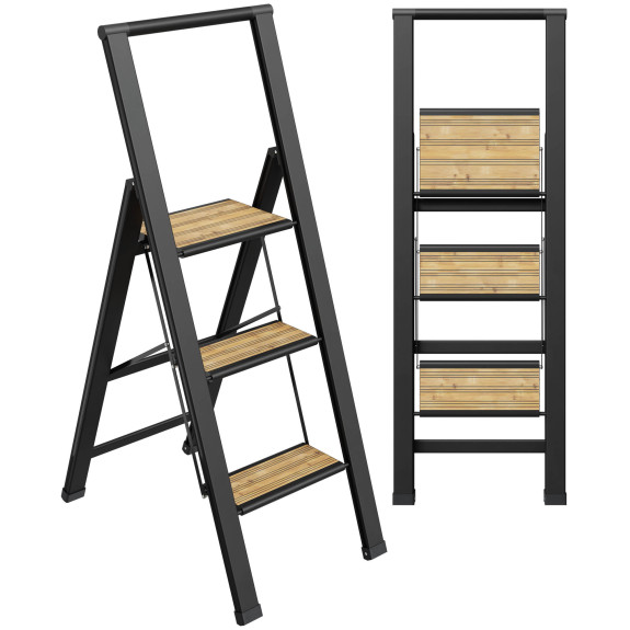The slim, space-saving design lets you fold the ladder to a compact size for storage. Once folded, the step ladder is barely 2" thick offering easy, convenient storage in very narrow places, say goodbye to big, bulky ladders. Lightweight and slim design make transportation a breeze
