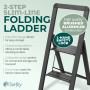 The slim, space-saving design lets you fold the ladder to a compact size for storage. Once folded, the step ladder is barely 2" thick offering easy, convenient storage in very narrow places, say goodbye to big, bulky ladders. Lightweight and slim design make transportation a breeze