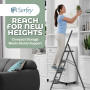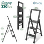 Anti-slip ribbed steps for added security and slipping prevention, the steps are made from high-quality brushed aluminum, providing strength and style. Rubberized feet keep the ladder from slipping and prevents your floor from getting scratched during use. Extra-large, the oversized top platform provides a safe, stable, and comfortable place to stand and eliminates fatigue