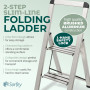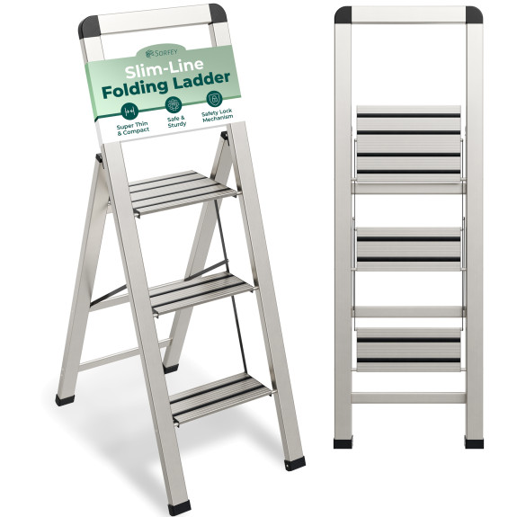 The slim, space-saving design lets you fold the ladder to a compact size for storage. Once folded, the step ladder is barely 2" thick offering easy, convenient storage in very narrow places, say goodbye to big, bulky ladders. Lightweight and slim design make transportation a breeze